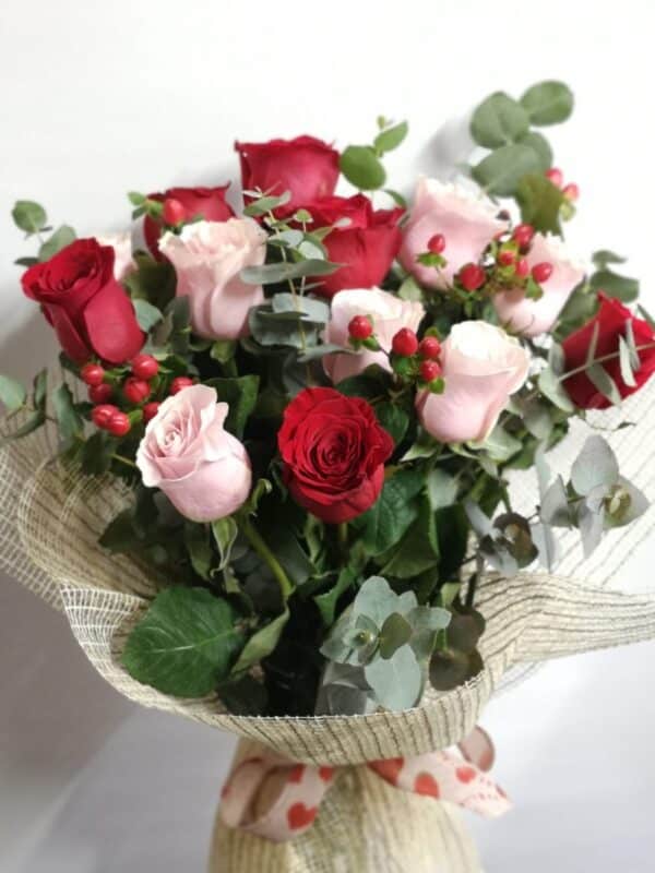 • Docena de rosas acompañadas de eucalipto e hypericum.